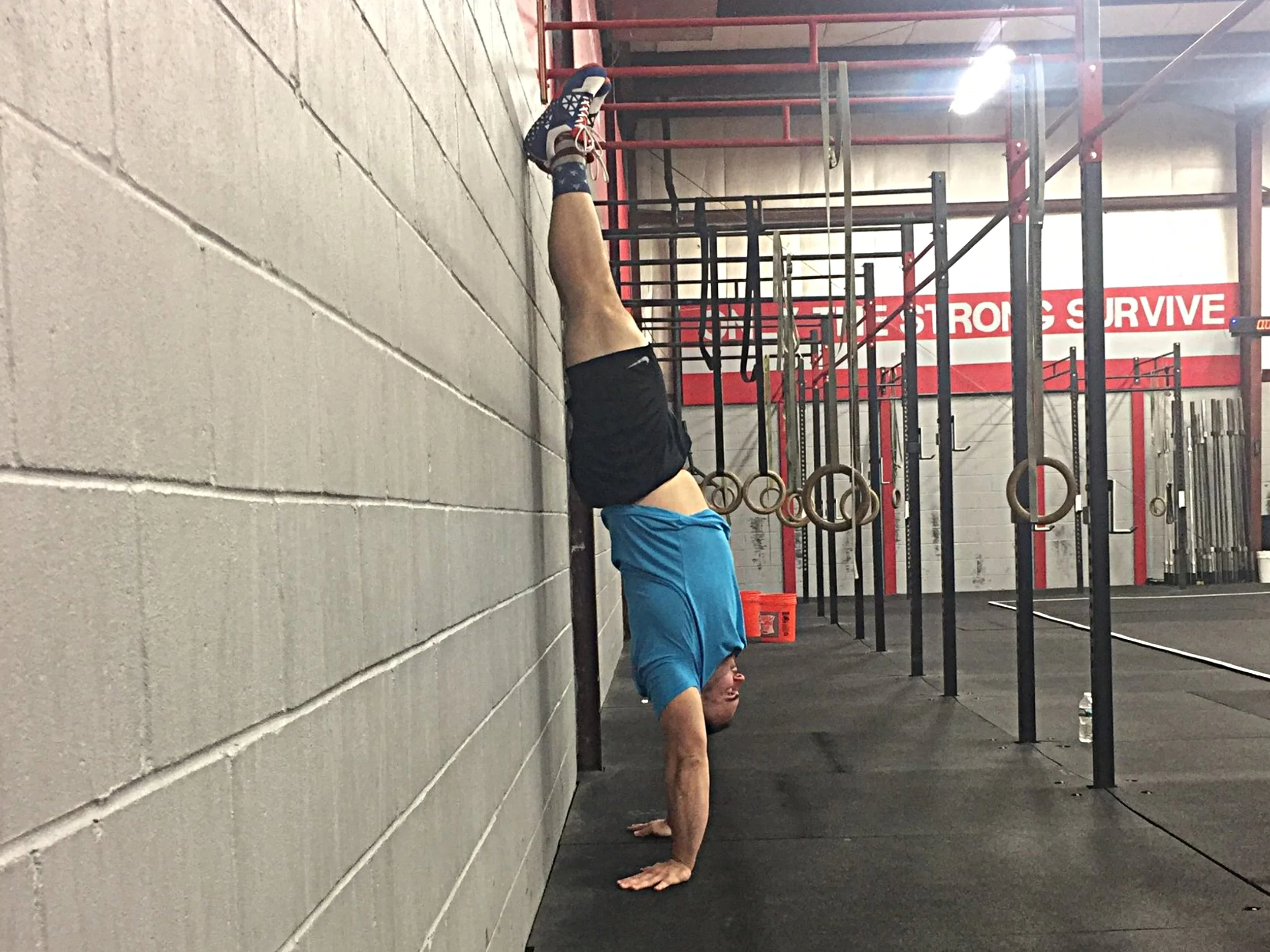 The stable position for having a weight overhead or holding a handstand is the same. Everything is stacked in a straight line over one’s center of balance. We are reaching through the shoulders to keep an active, stable shoulder. The kipping handstand push up is most similar to a push press. Aggressive extension of the knees and hips followed by an extension of the arms pushing the head through coming to a full locked out stacked position. As with every movement it is important to maintain a braced core otherwise the energy generated from the extension of the knees and hips will be lost and not aid in the lock out of the arms. Reducing these movements down, they are about transferring energy from the feet through to the hands or vice versa.